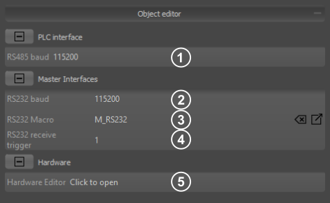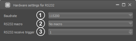 - RS232 Receive trigger: Specifies the number of bytes after which the receive macro is called. A retrigger takes place after the reception macro has been completely processed. This setting is not available for all modules.