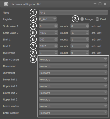 - Hysteresis: Specifies after which change of the analog channel the register value is changed and the affected macros are called.