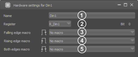 - Name of the input pin: An individual name can be assigned to each input. This name can be used to access the input in the macros. For example, if you want to read the state of the port pin with the name Din1, you must use the calculation