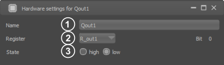 - Assigned register:: A register can optionally be assigned to the outputs. The value of the Register changes automatically when the state of an output pin changes. If the register value is changed, the respective outputs change analogously. If you want to set the output of the selected port pin to one, as in the example above, you can also set bit 0 of register 'R_out1' to one