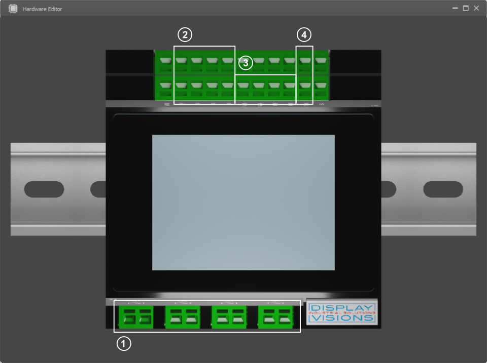 After opening the editor, the used module is shown. If there is a mouse over event over the port pins, the name of the respective port pin is displayed. Settings can be made with a click. This is exemplified by the module EA PLCC028-D8I4R4AR. If additional extensions are connected, these are also displayed in the hardware editor.