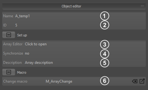 - Id: A unique ID is assigned to each array. Many commands require this Id to address the correct array. In PLCDesigner you can also reach the Id with the beautified name ID{A_temp1}