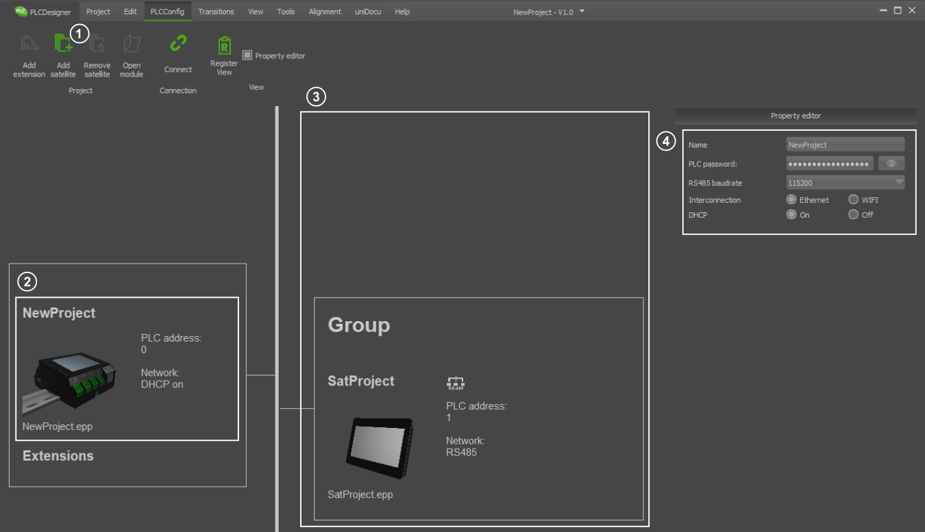 The core is the master in the system. The communication of all participants runs through it. The satellite project is assigned to the core later in the PLCConfig editor.