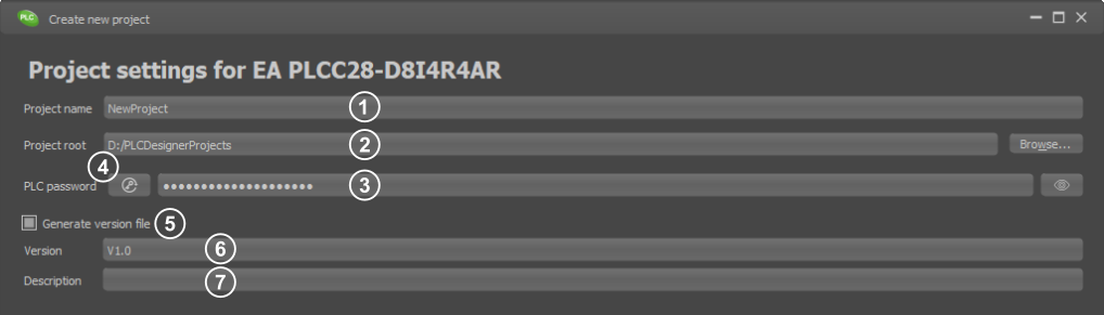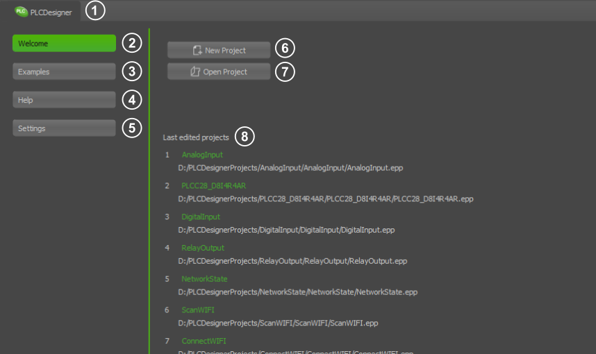 When you start PLCDesigner, the WelcomePage appears first. Here you can create new projects or open existing ones. You can also access the help file and sample projects.