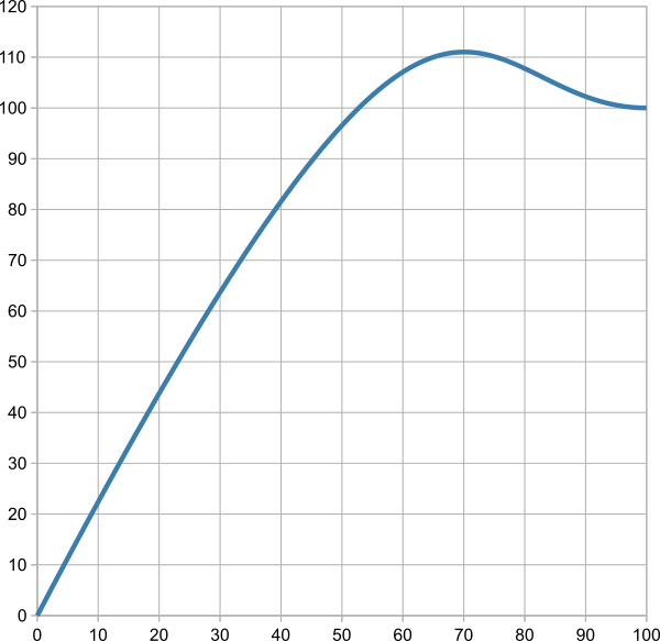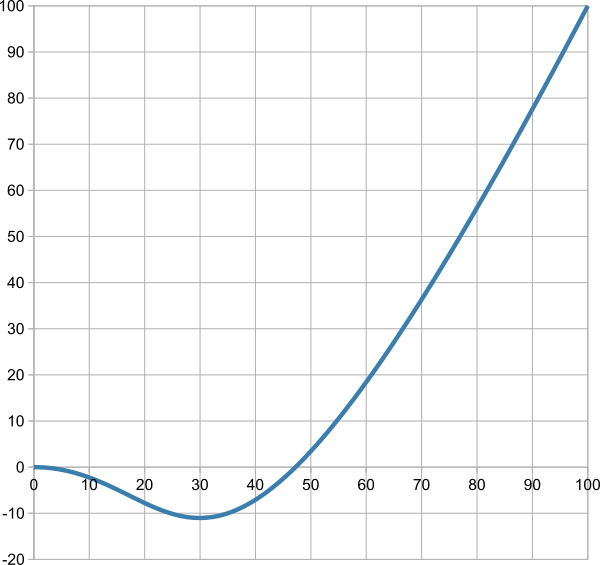 The command creates its own action curve, which specifies the time course of the animation. There are 10 predefined curves that can be overwritten. CurveNumber (1-10) indicates the action curve that is overwritten. The action curve is a cubic Bézier curve. The control points of the curve are specified with the parameters x1, y1, x2 and y2. The value range of the parameters is for X 0 ... 100, for Y -200 ... 300.