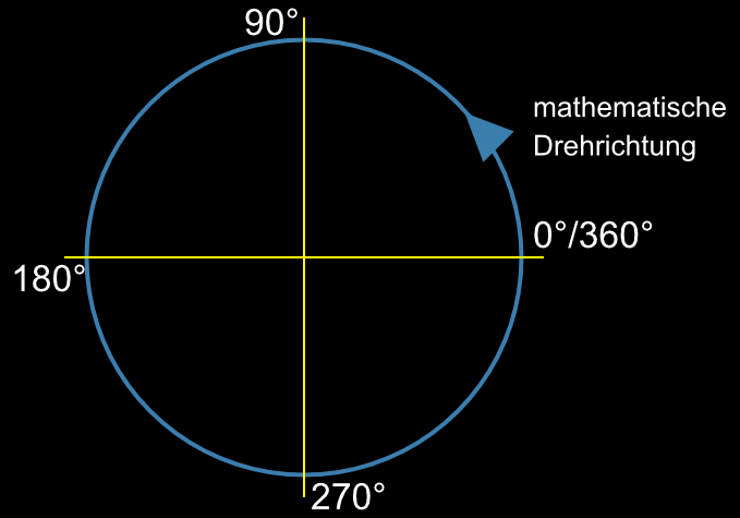 Angles are specified in the mathematical direction of rotation, i.e. counter-clockwise.