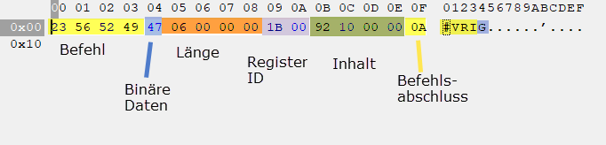 The instruction letters (in yellow) are followed by the identifier "G" for binary data. The length is calculated as follows: register ID (16 bits) + register contents (32 bits) = 6 bytes. The transmission of the data takes place in each case in little-endian format (Intel):