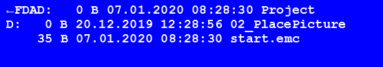The command saves all folder names that are in the <Path> in the string register (String-ID = ID ... IDn). The number is stored in the register Rregister ID = ID). (You can search with patterns ?/*, e.g. *New* stores all directories in which the word "New" occurs)