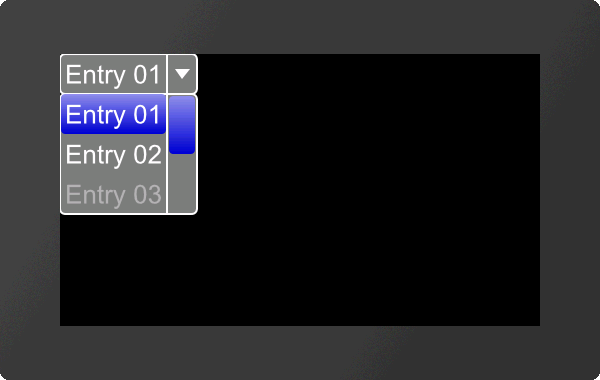 The parameter VisibleEntries defines the number of visible entries (VisibleEntries = 0: all entries visible). With the two optional parameters (BorderX and BorderY) the distance of the text to the edge of the menu can be specified. With the parameter Time the opening / closing of the ComboBox can be animated in 1/100s.