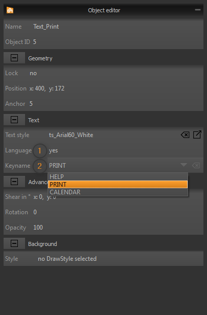 2. To use multiple languages together with objects  (e.g. Text, Button, SpinBox, …) the property "Language" need to be activated in the object editor.