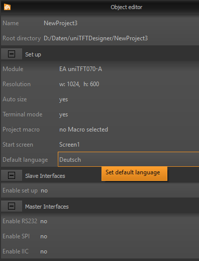 4. Select a default language in the Object editor of the project