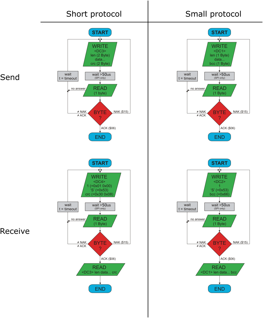 The transmission protocol is identical regardless of which of the serial interfaces (USB, RS-232, SPI...) is used to transfer data from external. All received data packages are collected in internal receive buffer, regardless which serial interface they come from.
