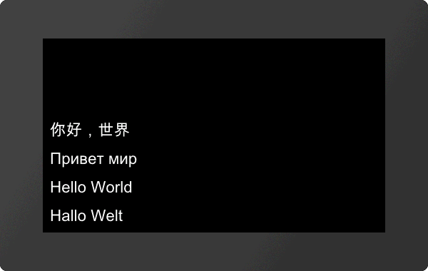 "Hello World" is placed in 4 different languages. It must be ensured that the selected font supports all necessary characters. In the following example "Arial Unicode MS" was used. The commands below assume that the string files (Chinese.txt, English.txt, Cyrillic.txt and German.txt) are already available on the SD card in the project path in the string's subfolder: