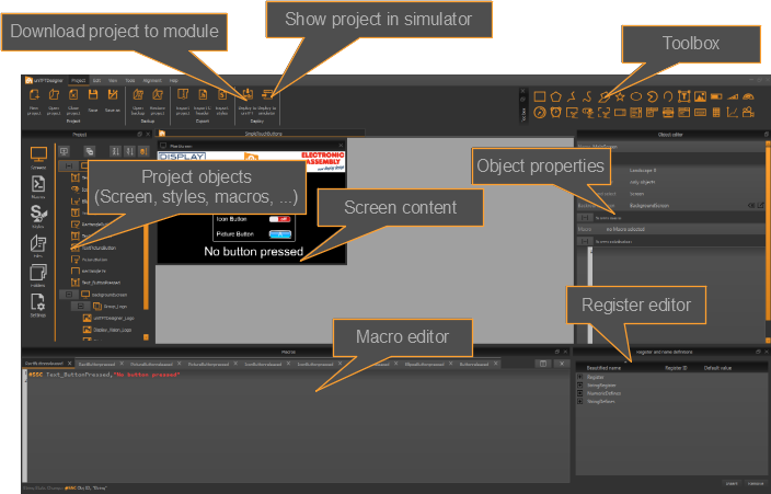 The Windows design software uniTFTDesigner (WYSIWYG) makes it easy to create complete screen layouts. With the help of the macro editor, functional sequences can be defined. The properties of all objects (position, size, angle) are easily adjustable. The touch functionality is also supported by uniTFTDesigner, so you can create radio groups, sliders, bar-graphs and simple touch-buttons. Touching a button may switch to a new screen or start a macro. An integrated simulator shows immediately the real screen including functionality. Also the digital and analogue inputs and outputs will be simulated. A comprehensive debug-function and the integrated help function round off this package.