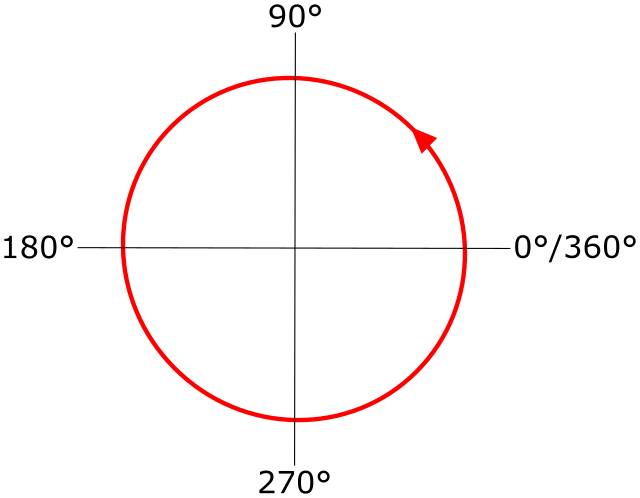 Angles are given in the mathematical sense of rotation (counter-clockwise). 0° is horizontally right:
