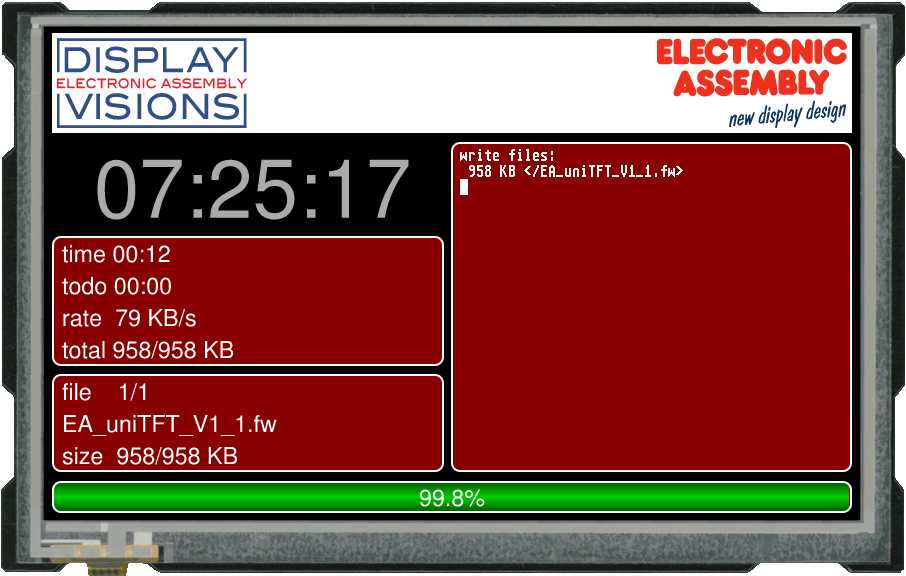 The firmware file also can be transferred to EA uniTFT with any system. To do this, transfer the contents of the * .fw file 1:1 (with protocol in packets) to the EA uniTFT. The transfer progress will become visible on the display module. After successful transfer, a data check will be done automatically. If the data is correct, the update starts automatically. Attention: Please do not switch off the module while updating.