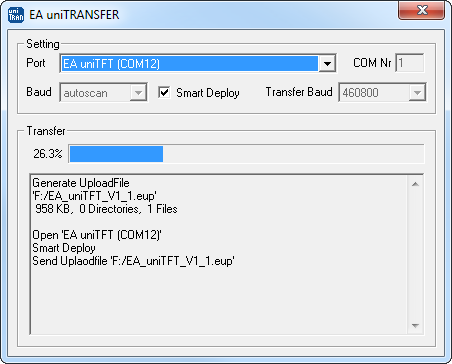 - Start uniTRANSFER.exe (found in the Simulator_and_Tools folder of the uniTFTDesigner installation) and select the correct serial interface to the EA uniTFT.