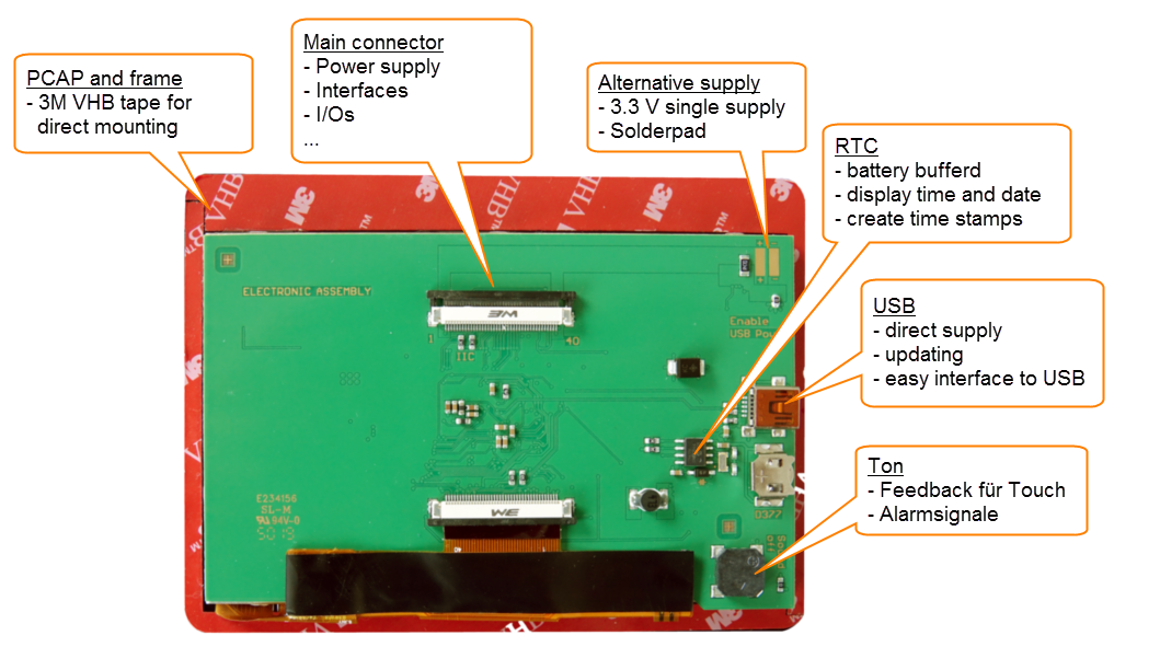 The modules do have an integrated capacitive touch panel. By touching the display you can enter data and make adjustments via menu or bar graph. The labelling, size and shape of the "keys" is flexible and can also be changed during runtime (different languages, icons). The drawing of the individual "keys", as well as the labelling is completely taken over by the built-in software. The capacitive touchpanel has an robust glass surface that can also be operated with thin gloves.
