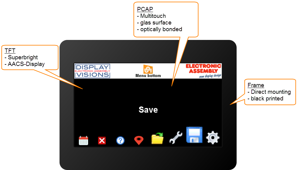 The EA uniTFTs-Series consists of a TFT/IPS-Display with LED backlight, driven by an integrated driving circuit, which is dimmable using software commands. In 24/7 operation the backlight can be dimmed automatically to increase the LED life-time and save energy. On the other hand brightness may rise to 150% for excellent readability even at direct sunlight. But it reduces life time of backlight.