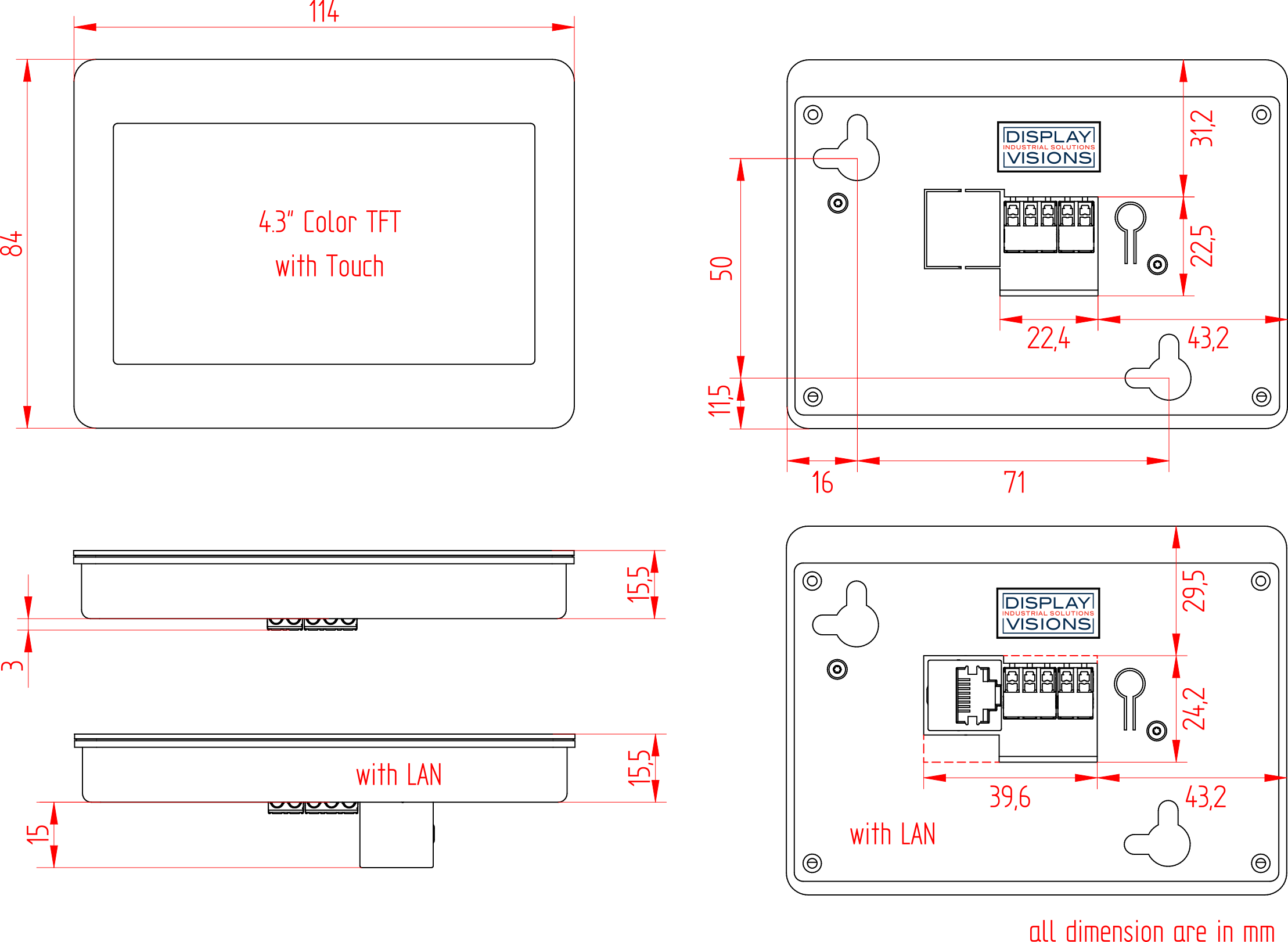 The EA PLCS43-DS is prepared for easy wall mount. Simply fixed by 2 screws 4x40 or similar. The dashed area represents the display outline and the connector zone for cable outlet.