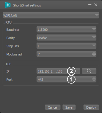 HMI DesignerDeploymentShort/Small protocol WIFI (1) Port 443 (2) IP 192.168.2.103 Project hardware settings Module interface settings Deployment settings