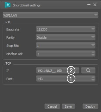 HMI DesignerDeploymentShort/Small protocol WIFI (1) Port 443 (2) IP 192.168.2.100 Project hardware settings Module interface settings Deployment settings