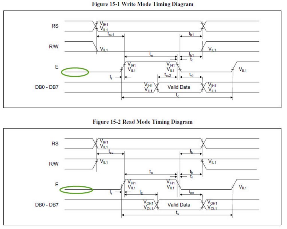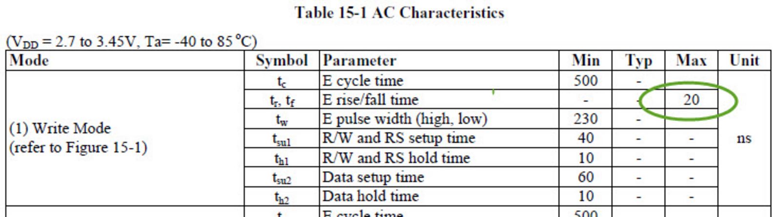 Im SPI-Mode fanden wir bei umfangreichen Test heraus, dass der SSD1803 mit einem Clock von bis zu 3 MHz läuft (damit allerdings weit ausserhalb der Spezifikation !) und der RW1073 nur bis 1.5 MHz. Aber beide arbeiten sauber innerhalb der Spezifikation: 1 MHz (tC= 1µs).