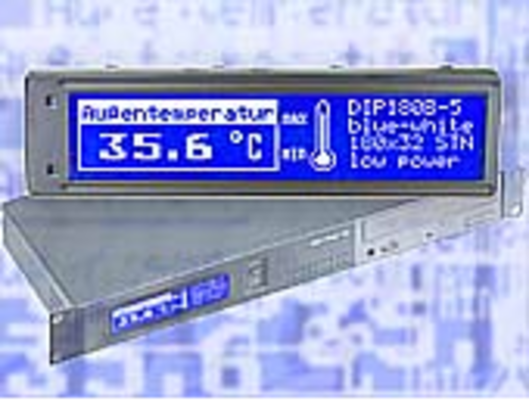 ELECTRONIC ASSEMBLY exceeds its standard product range with a new member of the established DIP-Module family. The new one EA DIP180B-5NLW is a blue-white 180x32 graphic module. It is distiguised by a famous contrast and a super bright LED backlight with low power of max. 45mA. More features are: very even backlight, super fast response (even at -20°C), as well as automatic temperature compensation and a built-in controller AX1520.