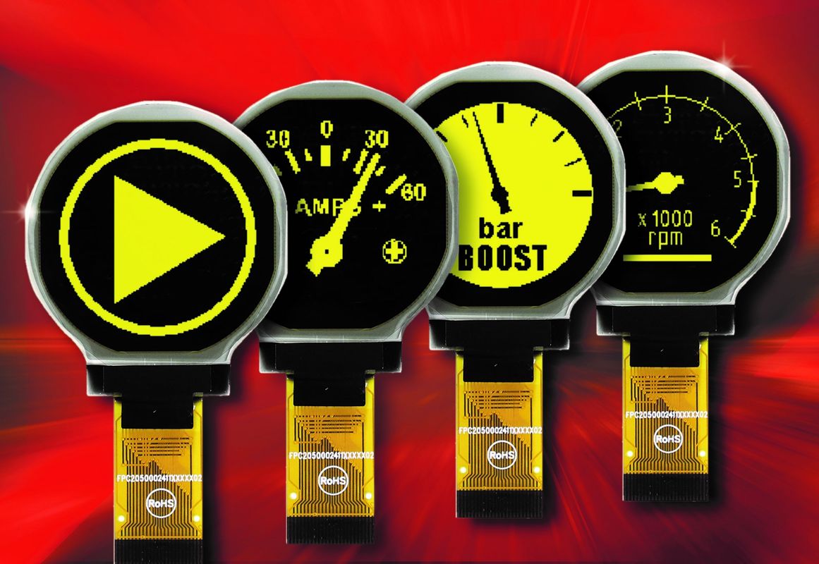 The displays have a diameter of 37 millimeters, making them the ideal virtual round instrument gages in industrial and process automation and in all applications where easy, intuitive readability is essential. The units are designed to operate over an enormous temperature range (-40°C to +80°C). They are built to withstand severe frost, tropical heat and harsh environments. They also have a remarkably fast response time. The 128 x 128 pixels switch state in a mere 10 microseconds even at temperatures well below zero.