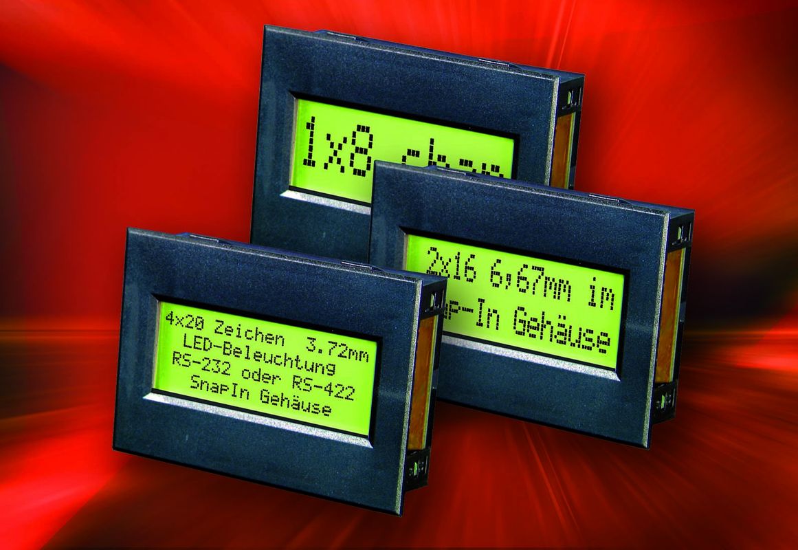 ELECTRONIC ASSEMBLY also offers part of its LCD Dotmatrix series in snap-in housings for fast, uncomplicated mounting. All displays are addressed via the serial RS-232C interface as standard. Optionally, control via RS-422 is also possible. Data transmission rates of 300, 1,200, 2,400 and 9,600 baud are selectable. The displays are ready for operation. All cursor controls, such as line feed, are executed automatically. The snap-in variants are available for three text displays with 1x8, 2x16 and 4x20 characters.