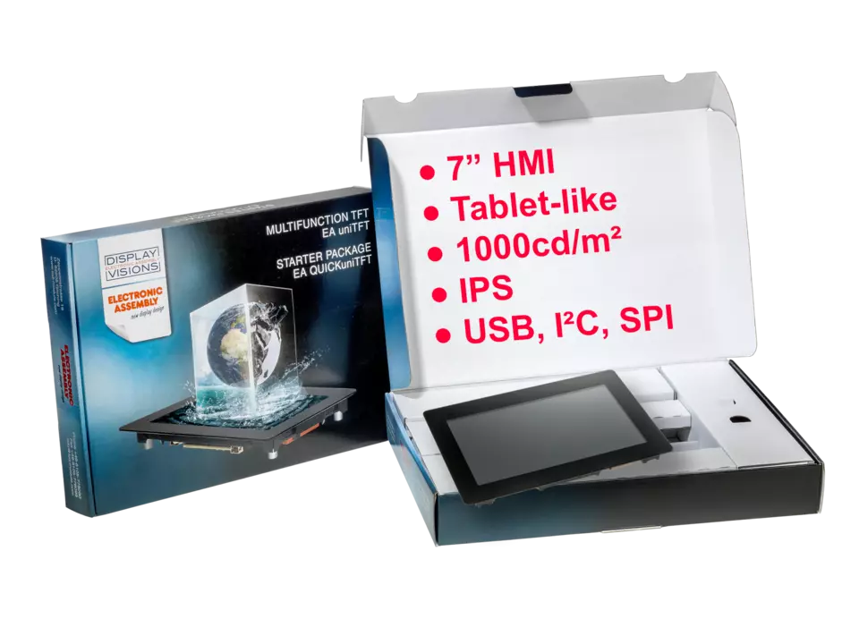 Convince yourselve of our all-rounder: EA uniTFT. You receive the starter package with 7“ multi function TFT display, capacitive touch panel and test board for special exhibition price of 280,- € net. No postage inside of Germany. More information on our EA uniTFT series.